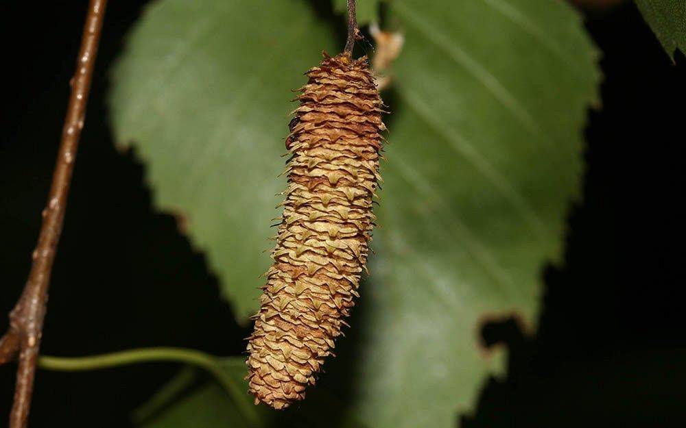 Wałeczkowate, żółtobrązowe owocostany rozsypują się, rozsiewając bardzo drobne orzeszki, każdy z dwoma małymi skrzydełkami, dzięki którym wiatr przenosi je na duże odległości. Nasiona szybko tracą zdolność kiełkowania; wiele z nich jest pustych i nie kiełkuje wcale.