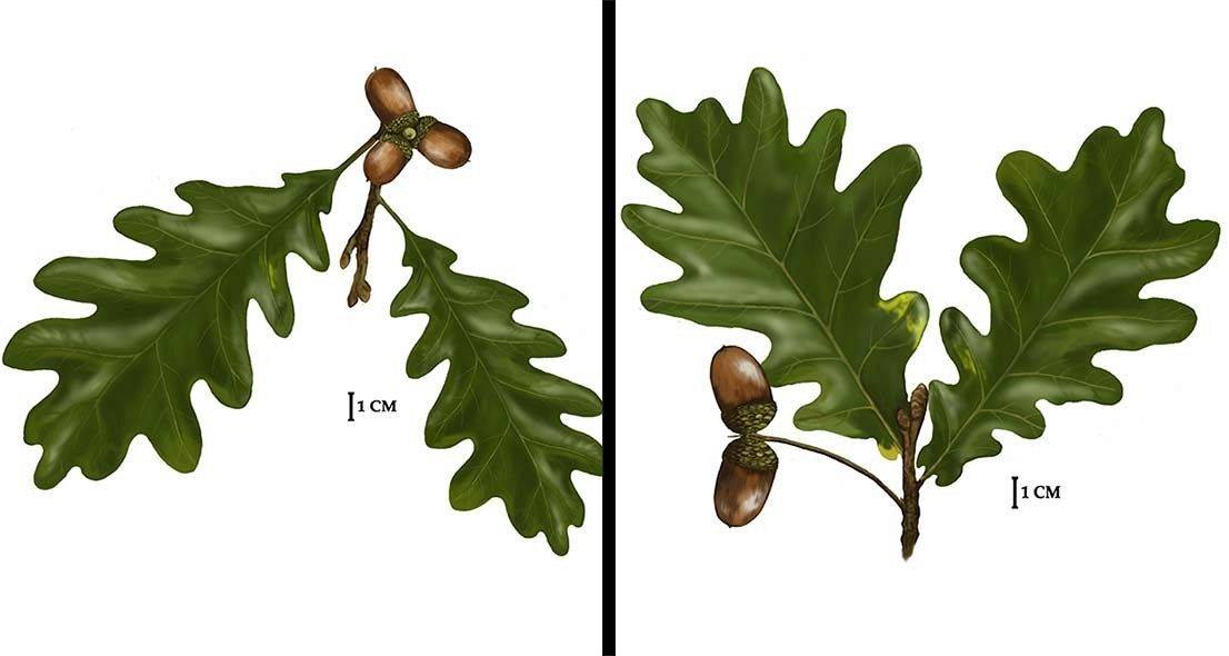 Liść dębu bezszypułkowego ma kształt zbliżony do liścia dębu szypułkowego – jest podobnie klapowany. Ma jednak długi ogonek liściowy, nie posiada „uszek” u nasady blaszki, która klinowato zbiega po ogonku. Nerwy boczne dochodzą tylko do klap.