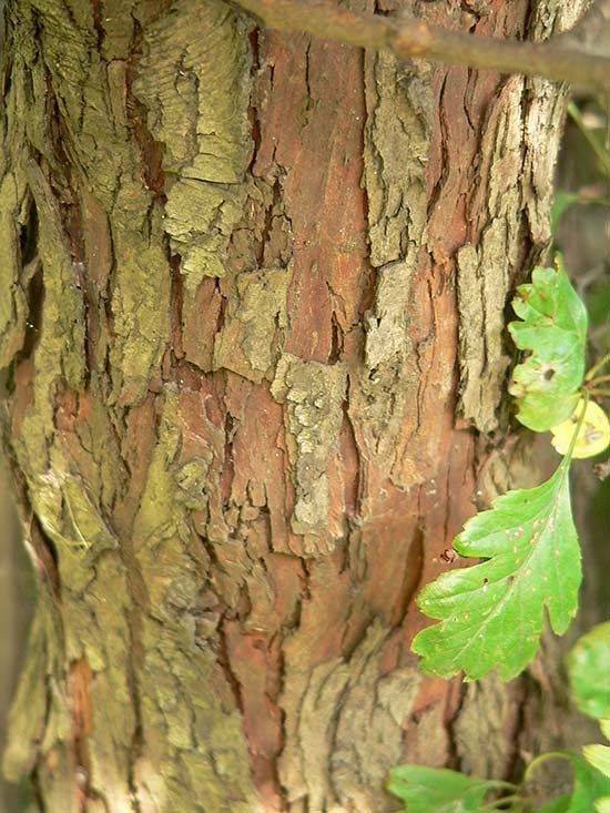 U młodych roślin jest szarozielona i gładka z czasem staje się ciemnobrązowa z płytkimi często spiralnie łuszczącymi się bruzdami.