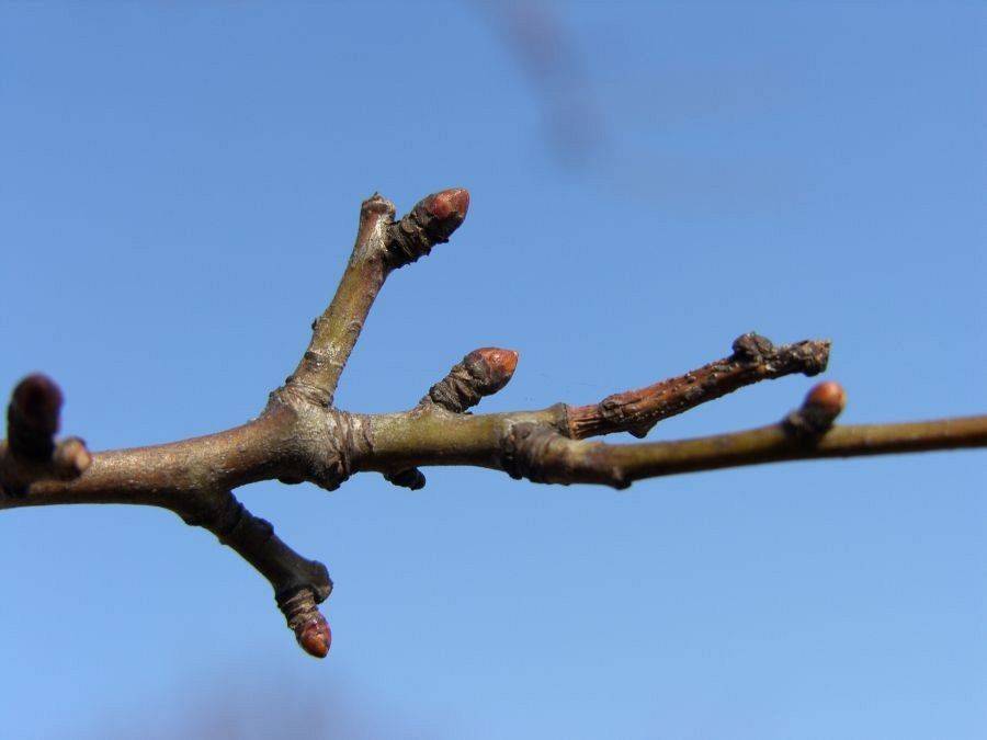 Pąki wierzchołkowe są jajowate lub okrągławe, na szczycie zaokrąglone lub spiczaste, większe od pąków bocznych. Łuski pokrywające pąki są brązowoczerwone z łatwo odpadającymi rzęskami. Brzegi łusek są ciemnobrązowe lub czarne.