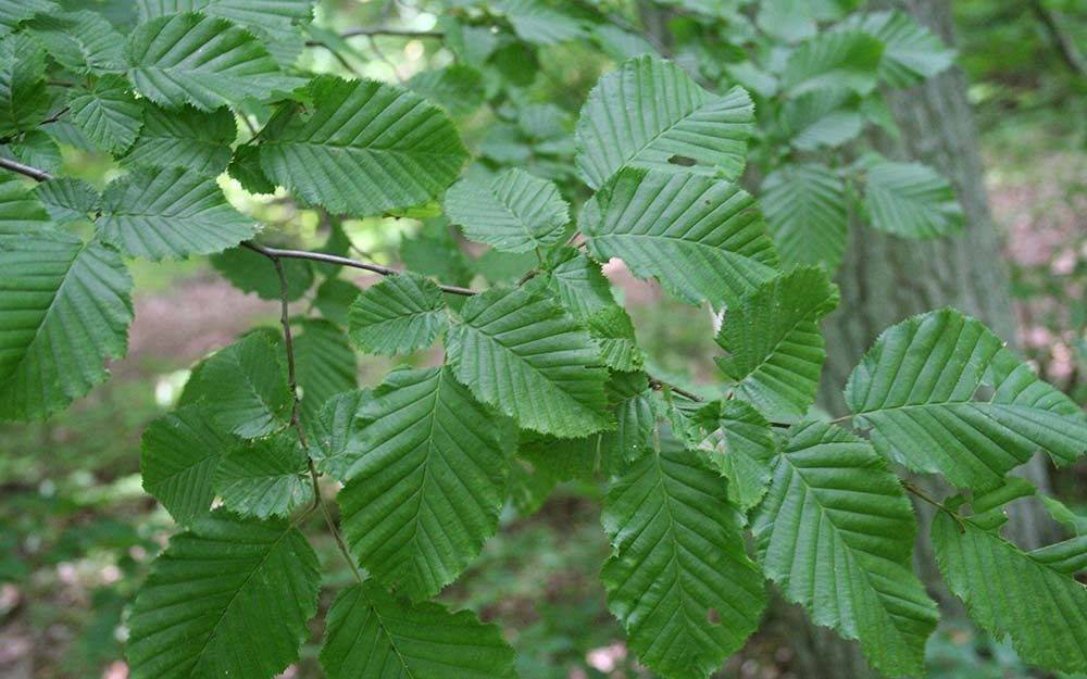 Eliptyczne lub wąskojajowate liście, u nasady zaokrąglone, mają ostro, podwójniepiłkowany brzeg oraz wyraźnie zaznaczone, równolegle ułożone nerwy boczne (11-15 par), sprawiające, że blaszka jest „harmonijkowato” pofałdowana. Na spodzie ma ona często kępki włosków. Wierzchołek liścia jest zaostrzony. Liście rozmieszczone są skrętolegle. Jesienią przebarwiają się na żółto.