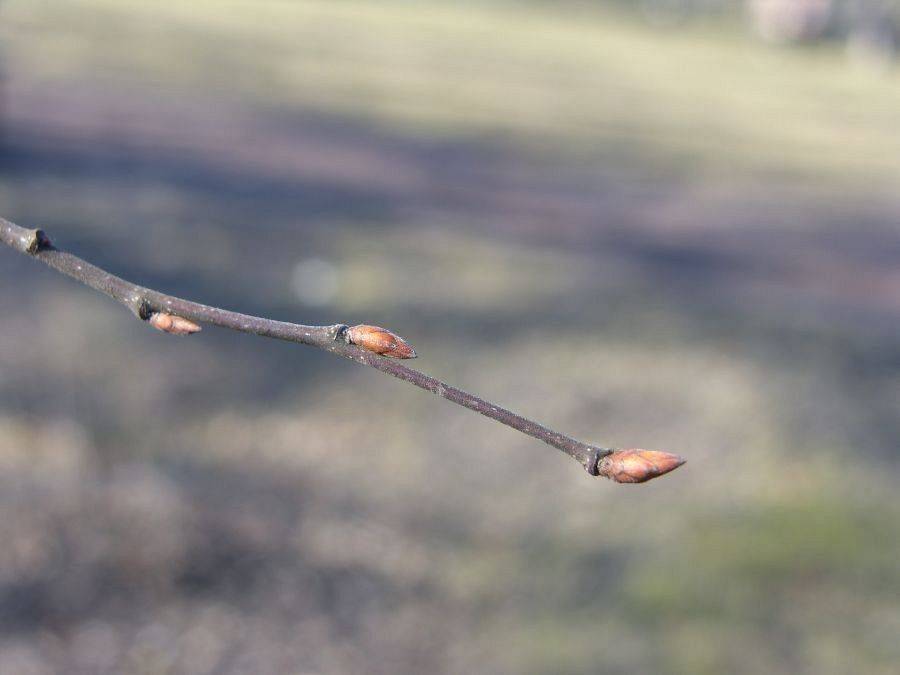 Młode pędy są oliwkowozielone lub brązowe i owłosione, starsze są szare lub czarno brązowe, smukłe. Pąki są długie i smukłe. Pąki boczne są mocno przylegające do pędu, zagięte do wewnątrz. Łuski pąków są jasno- lub ciemnobrązowe.